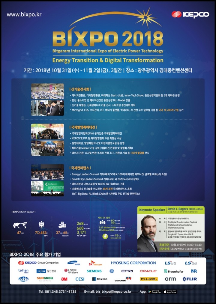 ‘2018 CIO 100 Awards’에서 3년 연속 CIO Awards를 수상한 세계적인 에너지 전문 기업 한전(KEPCO)이 10월 31일부터 11월 2일까지 3일간 광주 김대중컨벤션센터와 홀리데이인 호텔에서 글로벌 전력기술 분야 종합 박람회인 ‘2018 빛가람 국제 전력기술 엑스포(이하 BIXPO 2018)’를 개최한다고 밝혔다.