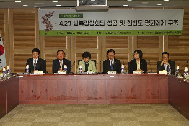민주평화당 한반도평화체제특별위원회(공동위원장 박지원, 정동영)는 9일 오후 3시부터 국회 의원회관 제2세미나실에서 조배숙 당 대표와 이정미 정의당 대표, 조명균 통일부장관, 민주평화당·정의당 소속 국회의원들이 참석한 가운데 ‘4.27 남북정상회담 성공 및 한반도 평화체제 구축 긴급 토론회’를 개최했다.