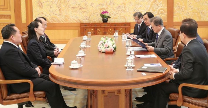 평창동계올림픽 북한 대표단인 김영남 최고인민회의 상임위원장과 김여정 당 중앙위원회 제1부부장이 문재인 대통령의 초청으로 10일 청와대를 방문하여 접견과 오찬을 함께했다.