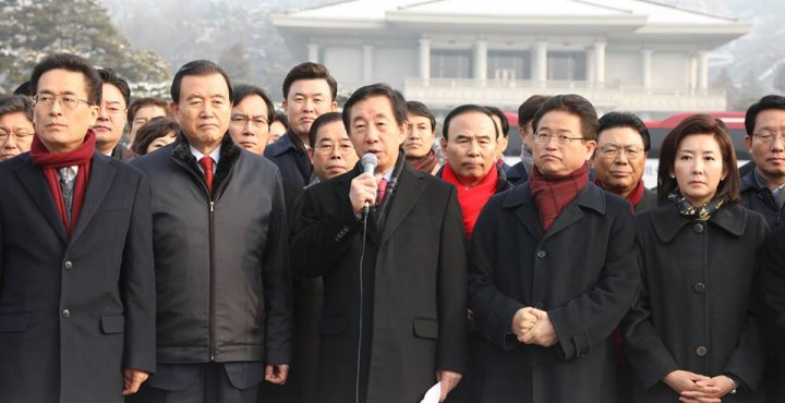 <사진 : 청와대 앞에서 김영철 방한 철회 촉구를 요구하고 있는 김성태 원내대표와 자유한국당 당원들. 출처 : 자유한국당>