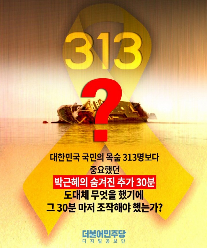 <사진 : 더불어민주당이 발표한 세월호 관련 “박근혜의 숨겨진 추가 30분” 포스터.