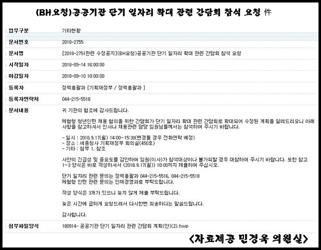 이어 “BH요청으로 공공기관 단기 일자리 확대 관련 간담회를 917일 오후 세종청사 기획재정부 회의실에서 개최한다며 다시 한번 공문을 발송했다. 이 공문에는 사안의 긴급성 및 중요도를 감안하여 임원(이사)이 참석대상이라고 명시돼 있다.