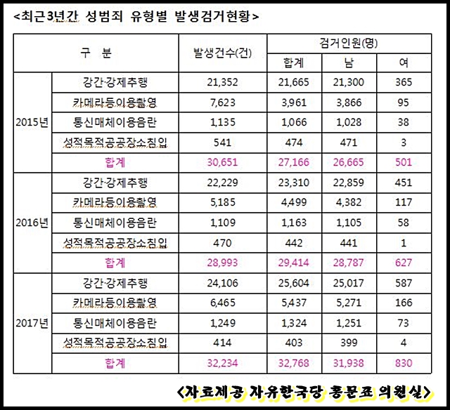 특히 최근 3년간(15-17) 전체 성 범죄 검거인원은 201527,166명에서 지난해 32,768명으로 5,602명이나 증가했고, 여성 성범죄자도 같은 기간 501830명으로 무려 65.7% 나 크게 증가했다.
