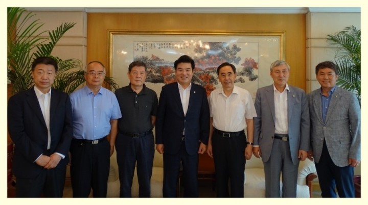 <사진 : 지난 222일 중국 광저우의 한 식당에서 국회 기우회 임원단과 중국 정치인들이 회동을 하고 있다. 왼쪽부터 중국기원 원장, 황젠추 전인대 의원, 두잉 정협 위원, 원유철 한국당 의원, 주샤오던 주임, 조훈현 한국당 의원, 김현권 민주당 의원. 사진제공 : 원유철 의원실>
