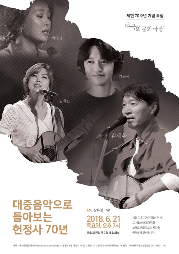 또한, 대중가요 전문가인 단국대 장유정 교수가 출연해 시대의 풍경, 국회와 헌법의 숨은 이야기를 함께 들려줄 예정이다. 공연은 무료이며, 티켓은 67일부터 국회 문화행사 홈페이지(http://culture.assembly.go.kr)를 통해 예약할 수 있다.