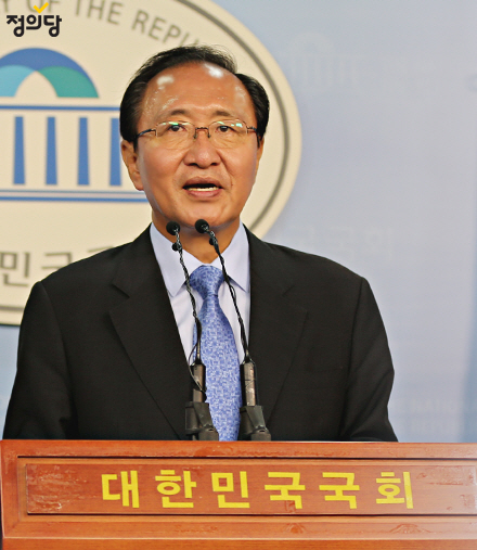 <사진 : 정론관에서 발표 중인 노회찬 의원. 출처 : 노회찬 의원 페이스북>