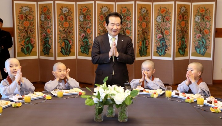 정세균 국회의장은 4일 오후 부처님오신날을 앞두고 대한불교조계종 조계사에서 20일 동안 단기출가 중인 동자승들을 국회 사랑재로 초청해 다과를 나누고 선물을 전달했다.
