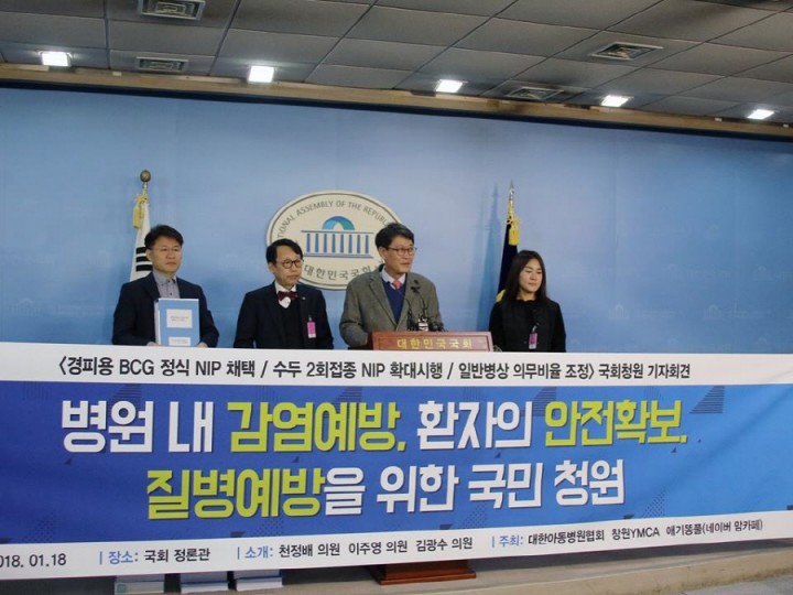 대한아동병원협회는 국민의당 김광수의원, 천정배의원 및 자유한국당 이주영의원을 입법청원 소개의원으로 “경피용 BCG의 정식 NIP 채택, 수두 2회 추가접종 NIP 확대 시행을 비롯해 소아청소년과 병원 일반병상 의무 확보비율 수정 요구를 골자로 하는 총 3종의 청원서를 18일 국회에 제출하며, 10시 30분 국회 정론관에서 기자회견을 열었다. 이 자리에는 2만명이 넘는 대규모 회원을 가진 네이버맘카페 ”애기똥풀“ 및 YMCA 관계자가 배석하여 뜻을 같이했다.