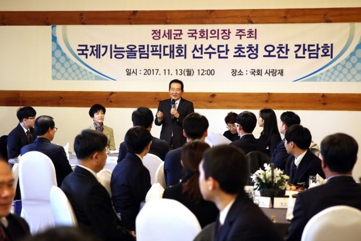 정 의장은 국제기능올림픽대회에 28차례 참가해 종합우승 19회 등 25차례 종합 3위안에 입상한 우리 선수단의 탁월한 성과를 언급한 후, “여러분의 선배들은 대한민국 산업화를 일궈낸 주인공이며, 여러분은 대한민국의 내일을 이끌어갈 인재들”이라면서 국회 또한 더 많은 관심과 지원을 해줄 것을 약속했다.