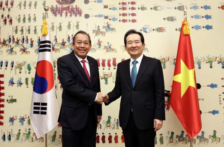 이에 쯔엉 화 빙(Truong Hoa Binh) 수석부총리는 “공동이익과 평화발전을 위한 양국의 지난 25년간 성과를 강조한 뒤, 올해 4월 정 의장의 베트남 방문을 계기로 양국 의회간 상호협력 및 교류가 보다 강화되었다”면서 “향후 베트남의 스마트도시 건설 및 인프라사업 등 경제, 교역, 투자 분야에서 한국 기업의 투자와 기술협력 확대를 희망한다”고 말했다.